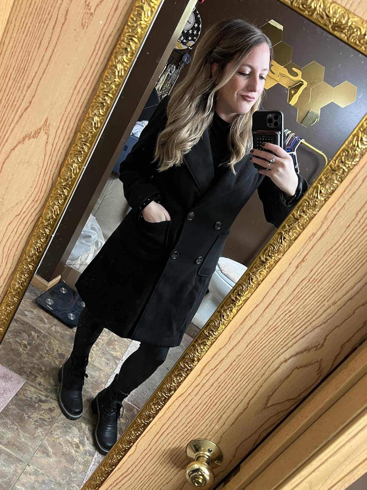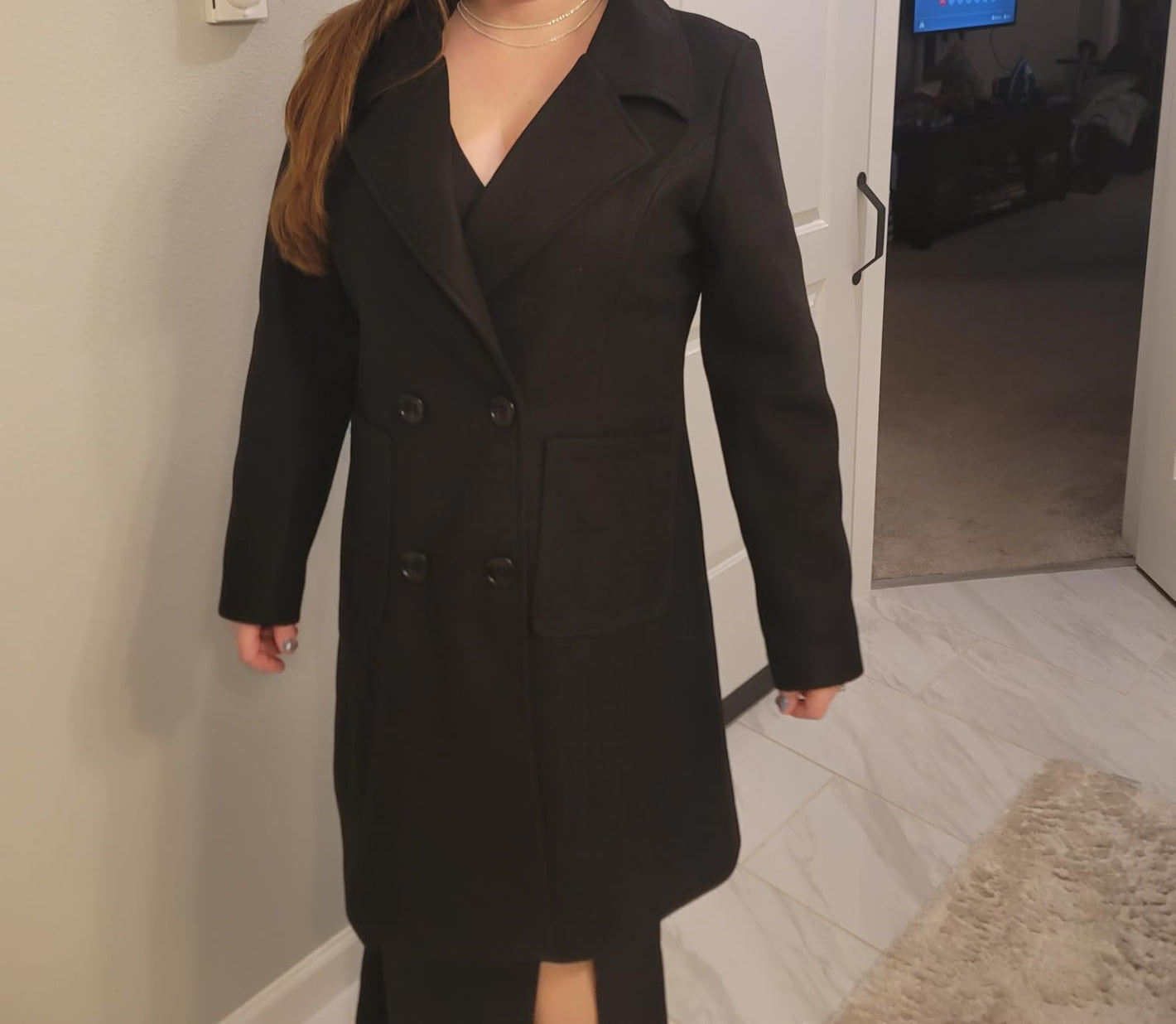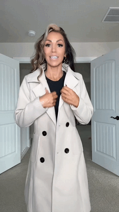 The coat runs true to size and feels soft, structured, and comfortable. Its wool-blend fabric and smooth lining provide the perfect balance between warmth and lightweight wear. For layering thicker sweaters, consider sizing up for extra comfort.